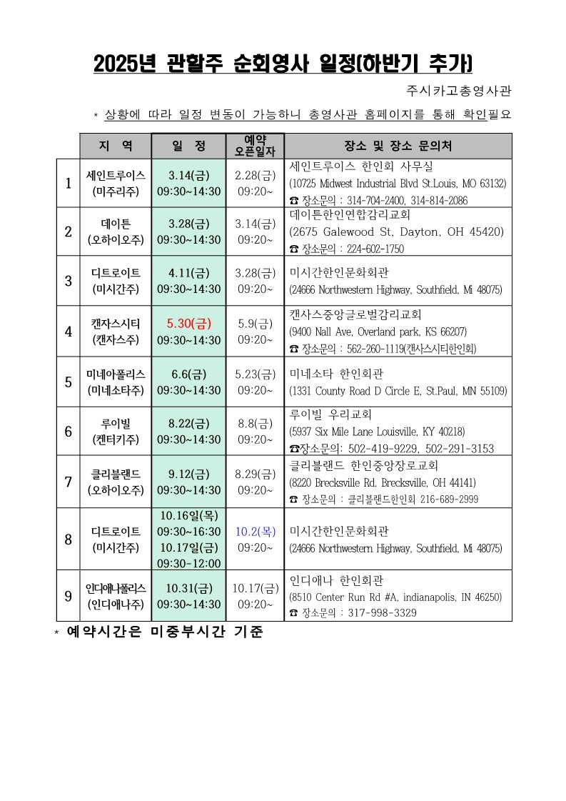 2025년 관할주 순회영사 일정 (하반기 추가)